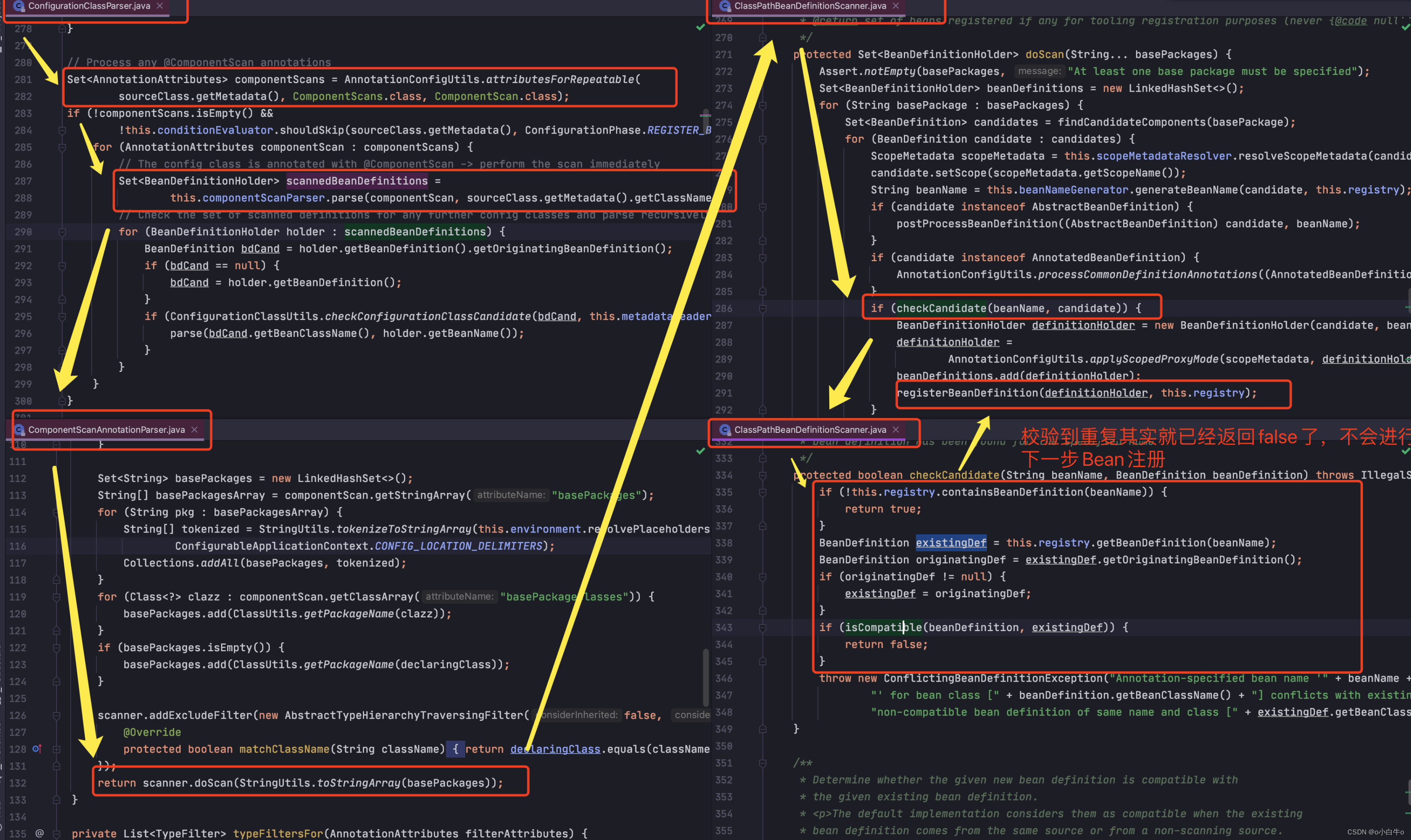 从上述截图中可以看出,扫描包进行Bean注册,他会进行防重复的校验,所以避免了重复Bean注册的异常。