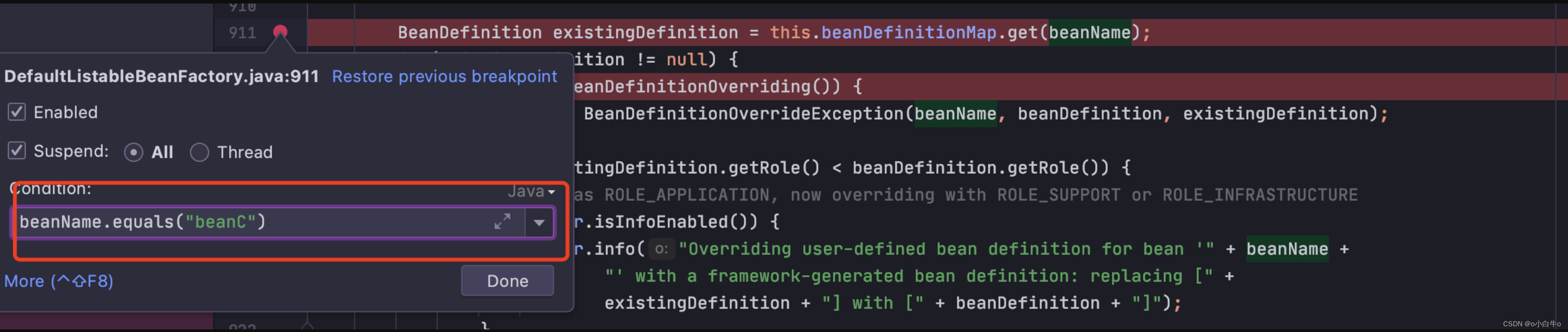 @ConditionalOnMissingBean生效问题,了解这个注解的人应该都知道,这个如果是先扫描A组件的BeanC,再扫描B组件的BeanC,是没法生效的,再根据之前的异常日志中描述的谁和谁冲突,结合个人经验来判断,大概率原因应该是应用X是先扫描了组件A的BeanC声明,再扫描到组件B的BeanC声明,导致BeanC在注册的时候,无法通过Bean重复定义的校验,而测试用的应用W,先扫描了组件B的BeanC声明,再扫描到组件A的BeanC声明,而组件A扫描的时候,@ConditionalOnMissingBean应该生效了,所以没有进一步注册,被跳过,应用正常启动。为了求证,果断的对应用X开启了debug模式,并加了断点的条件便于调试,