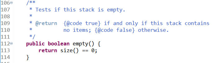 91行说明“查看栈顶的元素,但是不将元素从栈中移出”。首先,判断栈是否为空,若为空则抛出异常。否则,返回栈顶元素。注意,pop 方法调用了该 peek 方法,并在此基础上增加了移出栈顶元素的操作。