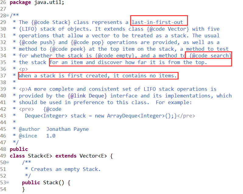 通过上述源码可知,Stack 类继承了 Vector 类(该类实现了List接口)。它的构造方法仅仅包括无参构造,创建一个空栈。