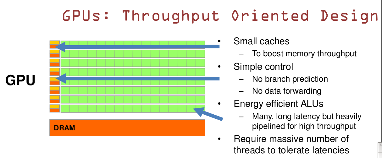 GPU的虽然有dram延时,却有非常多的ALU和非常多的thread. 为啦平衡内存延时的问题,我们可以中充分利用多的ALU的特性达到一个非常大的吞吐量的效果。尽可能多的分配多的Threads.通常来看GPU ALU会有非常重的pipeline就是因为这样。