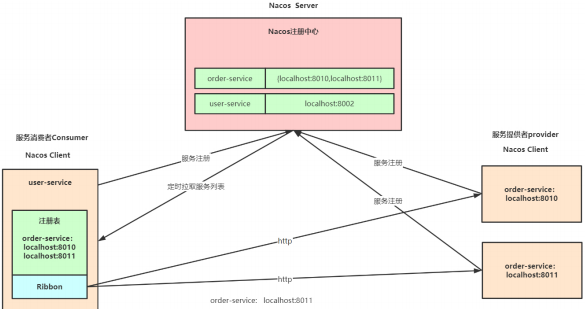 服务发现:服务消费者(Nacos Client)在调用服务提供者的服务时,会发送一个REST请求给 Nacos Server,获取上面注册的服务清单,并且缓存在Nacos Client本地,同时会在Nacos