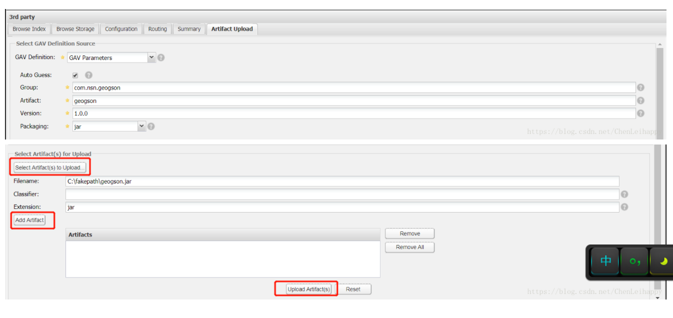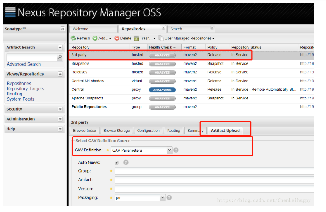 首先登陆nexus,进入3rd party,选择Artifact Upload,如图:
