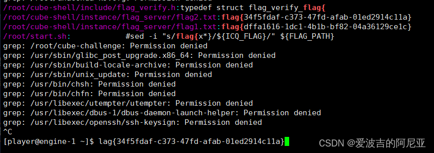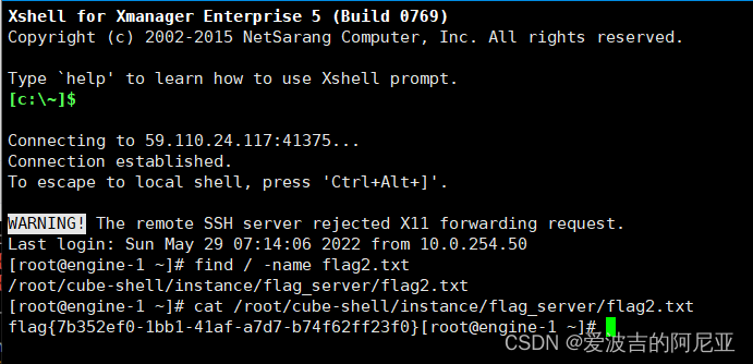 本题含有两个flag,请点击“下发赛题”,本题容器下发后的端口是ssh端口,ssh的账号密码均为:player;ssh登录上去可自行修改密码。请参考说明文档,获取flag,并在本题提交第一个获取到的flag。
