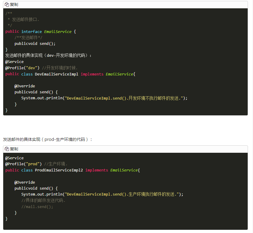 我们可以借助Spring的注解@Profile实现这样的功能,这样需要定义两个实现EmailService借口的类: