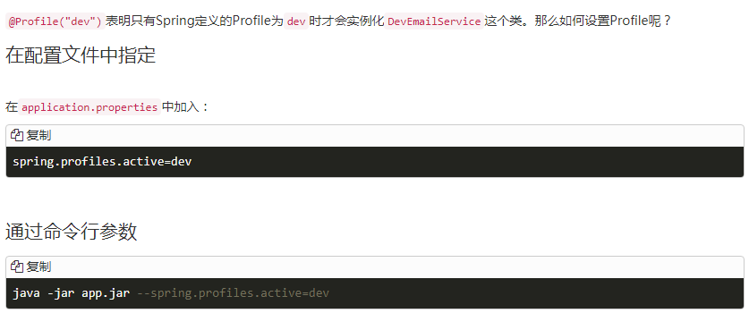 在某些情况下,应用的某些业务逻辑可能需要有不同的实现。例如邮件服务,假设EmailService中包含的send(String email)方法向指定地址发送电子邮件,但是我们仅仅希望在生产环境中才执行真正发送邮件的代码,而开发环境里则不发送以免向用户发送无意义的垃圾邮件。