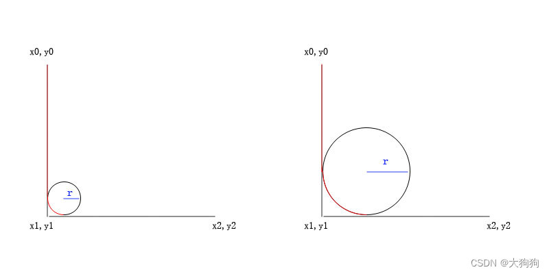 弧线的大小取决于r的大小。如果r定义的比较大,那么L的两条边可以无限向两端延伸。如果架子大而r小,那么(x0,y0)->(x1,y1)这条边的长度可能影响到绘制效果。如上图,红色线条是最终画出来的效果。上图中如果将(x0,y0)与(x2,y2)互换,画出来的效果是不同的(不同的直线部分)。但如果L型两条边不大于r,那么互换(x0,y0)与(x2,y2)不影响画出来的形状(只有弧线)。