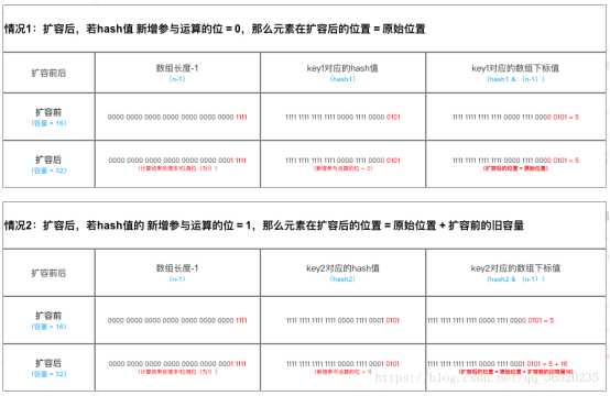 2)而在JDK1.8的时候直接用了JDK1.7的时候计算的规律,也就是扩容前的原始位置+扩容的大小值=JDK1.8的计算方式,而不再是JDK1.7的那种异或的方法。但是这种方式就相当于只需要判断Hash值的新增参与运算的位是0还是1就直接迅速计算出了扩容后的储存方式。