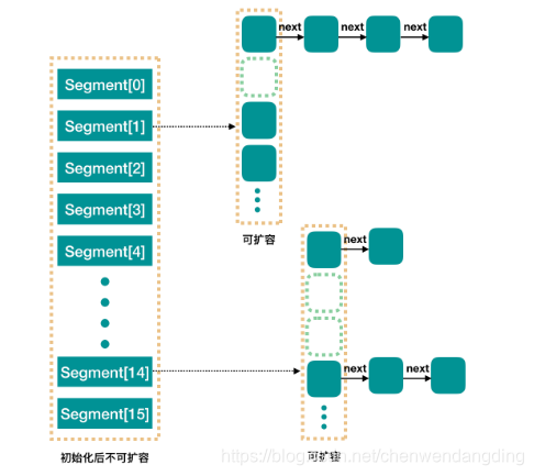 ConcurrentHashMap结构分为两部分:segment数组,不可扩容;segment中的内部数组和链表,内部数组可扩容