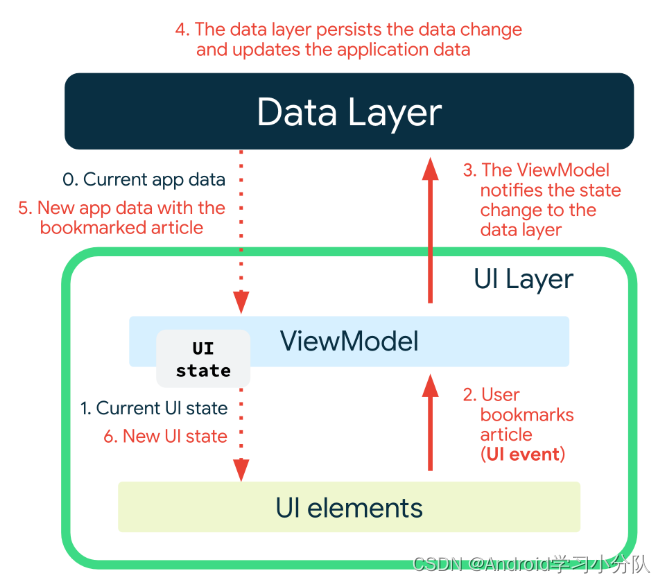 单项数据流建立了上面这张图的模型,种分离可让界面只发挥其名称所表明的作用:通过观察 UI 状态变化来显示信息,并通过将这些变化传递给 ViewModel 来传递用户的输入。 换句话说,单项数据流有助于实现以下几点: