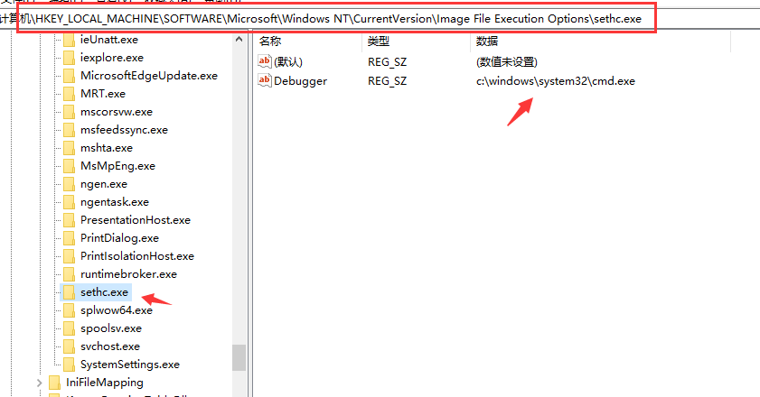 在此注册表位置添加项sethc.exe,添加debugger键的值为c:\windows\system32\cmd.exe