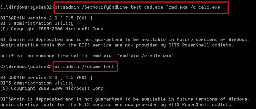 bitsadmin /SetNotifyCmdLine test cmd.exe "cmd.exe /c calc.exe"