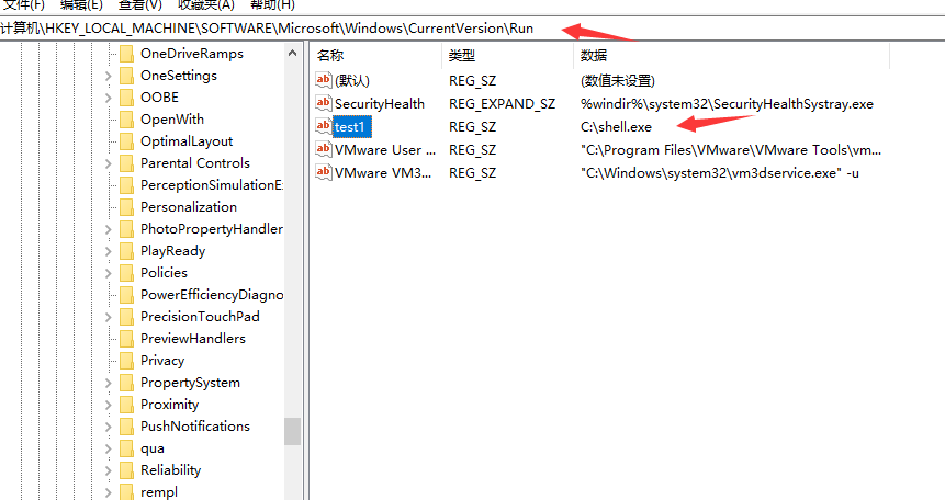 首先创建后门程序,HKEY_LOCAL_MACHINE\SOFTWARE\Microsoft\Windows\CurrentVersion\Run,添加键test,值为后门程序路径