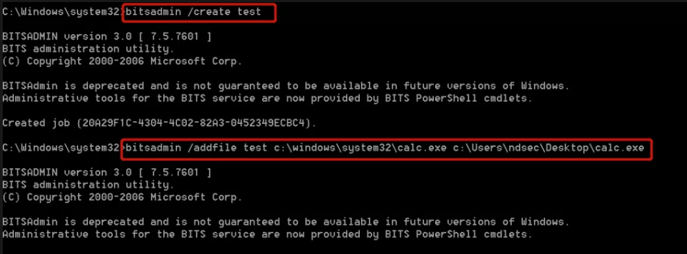 bitsadmin /addfile test c:\windows\system32\calc.exe c:\Users\ndsec\Desktop\calc.exe
