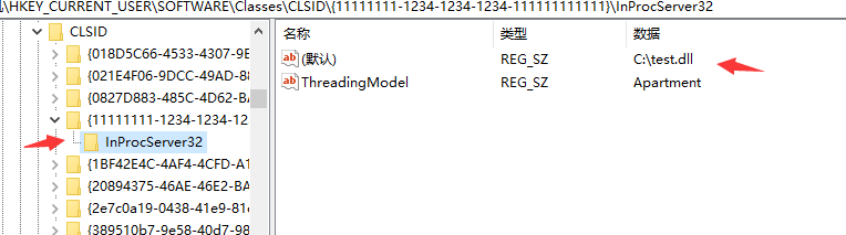 REG ADD "HKEY_CURRENT_USER\Software\Classes\CLSID\{11111111-1234-1234-1234-111111111111}\InProcServer32" /VE /T REG_SZ /D "C:\test.dll" /FREG ADD "HKEY_CURRENT_USER\Software\Classes\CLSID\{11111111-1234-1234-1234-111111111111}\InProcServer32" /V ThreadingModel /T REG_SZ /D Apartment /F