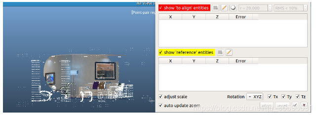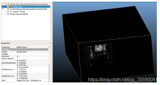 如上图,这里的living-room.obj是提供的真值,下面的room0.klg.ply则是我估计的三维点云模型。