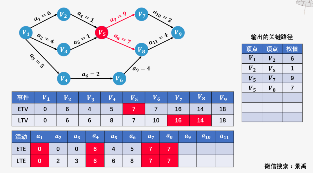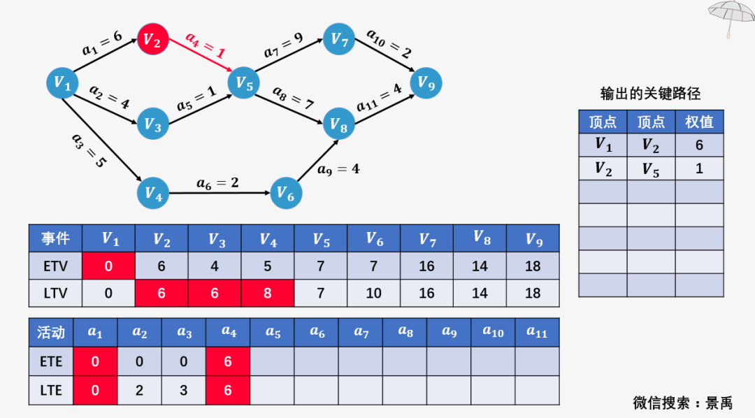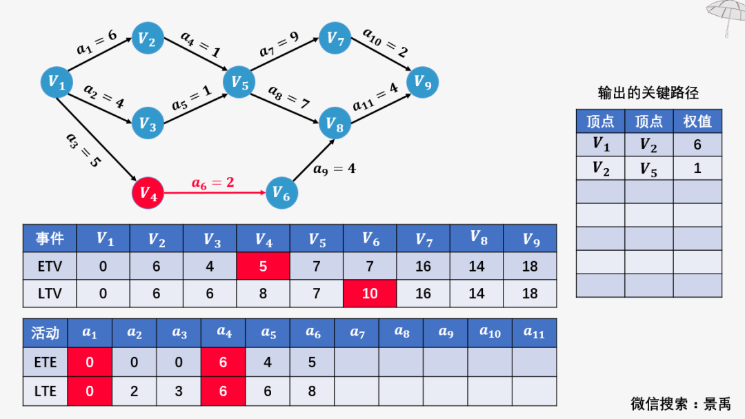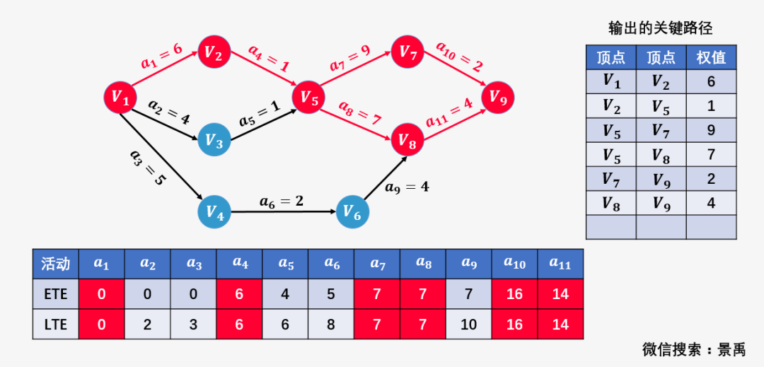 从上面也就可以看出 只要知道了每一个事件(顶点)的ETV 和 LTV,就可以推断出对应的 ETE 和 LTE . 此外还需要注意,关键路径是活动的集合,而不是事件的集合,所以当我们求得 ETV 和 LTV 之后,还需要计算 ETE 和 LTE 。