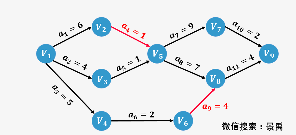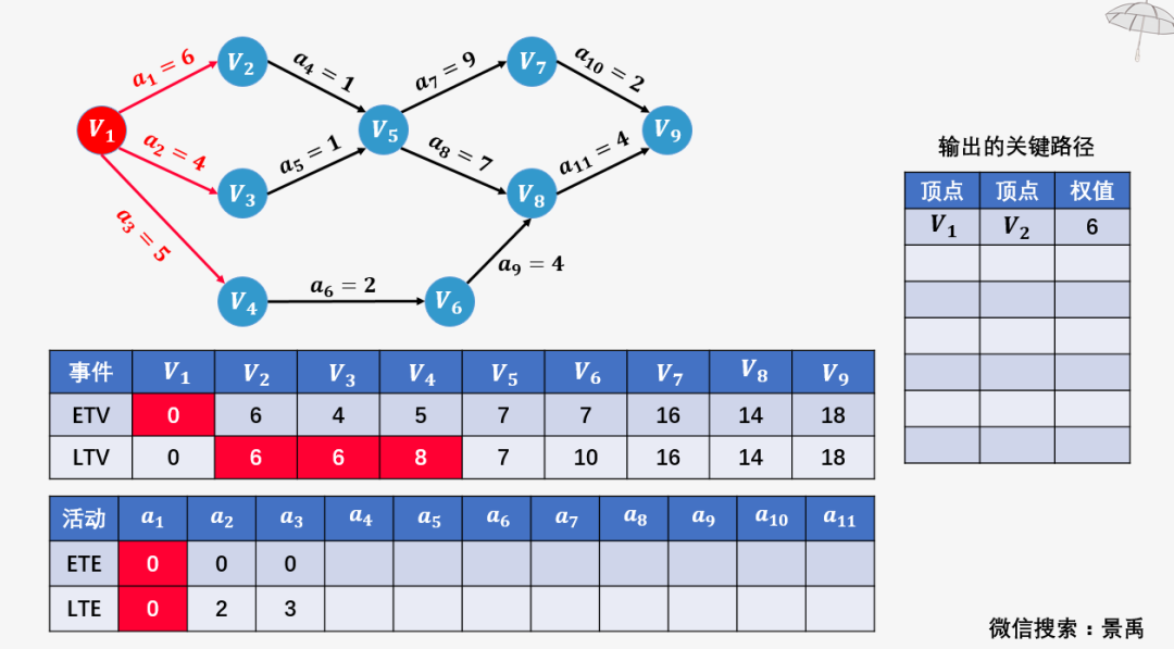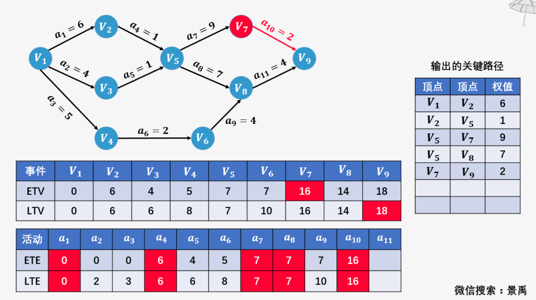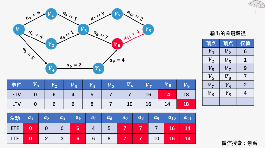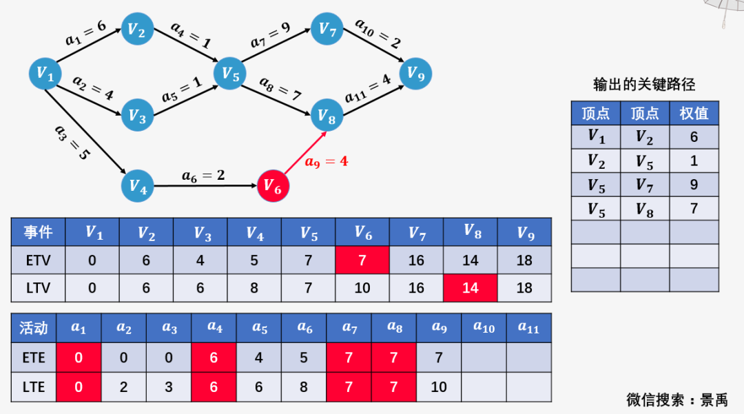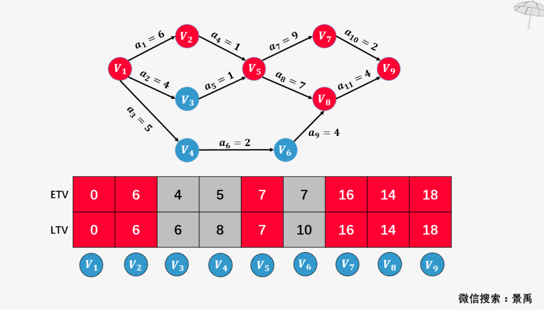 前面景禹在谈关键路径的概念时给出了一条上图中的关键路径,该关键路径(,,,,)的长度为18,为什么要提这个长度呢,因为要计算某一个事件的最晚发生时间,我们需要从汇点进行倒推。计算顶点的最晚发生时间为例,已知关键路径的长度为18,事件到汇点所需要的时间为 1 + 9 + 2 = 12,则事件的最晚发生时间为18-12 = 6,聪明的小禹禹一定发现,这和事件的最早发生时间不是一样吗?的确如此,对于关键路径上的顶点都满足最早发生时间 etv 等于 最晚发生时间 ltv 的情况,这也是我们识别关键活动的关键所在。再来计算一下事件的最晚发生时间,事件到汇点所需要的时间为 4 + 4 = 8,则事件的最晚发生时间为 18 - 8 = 10;相当于说活动完成之后,大可以休息 3天,再去完成活动也不会影响整个工期。