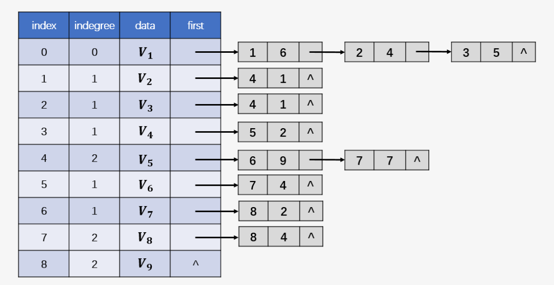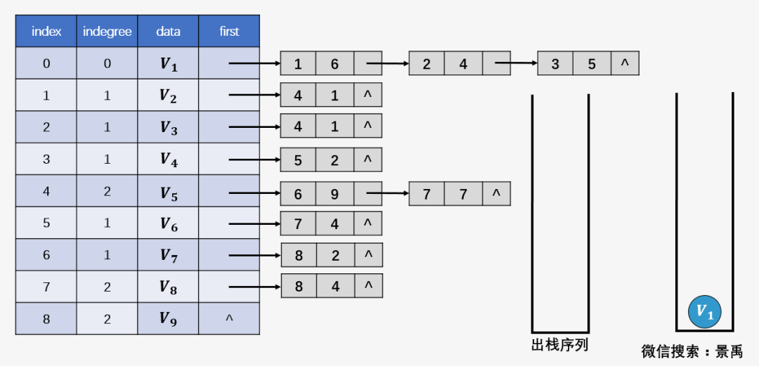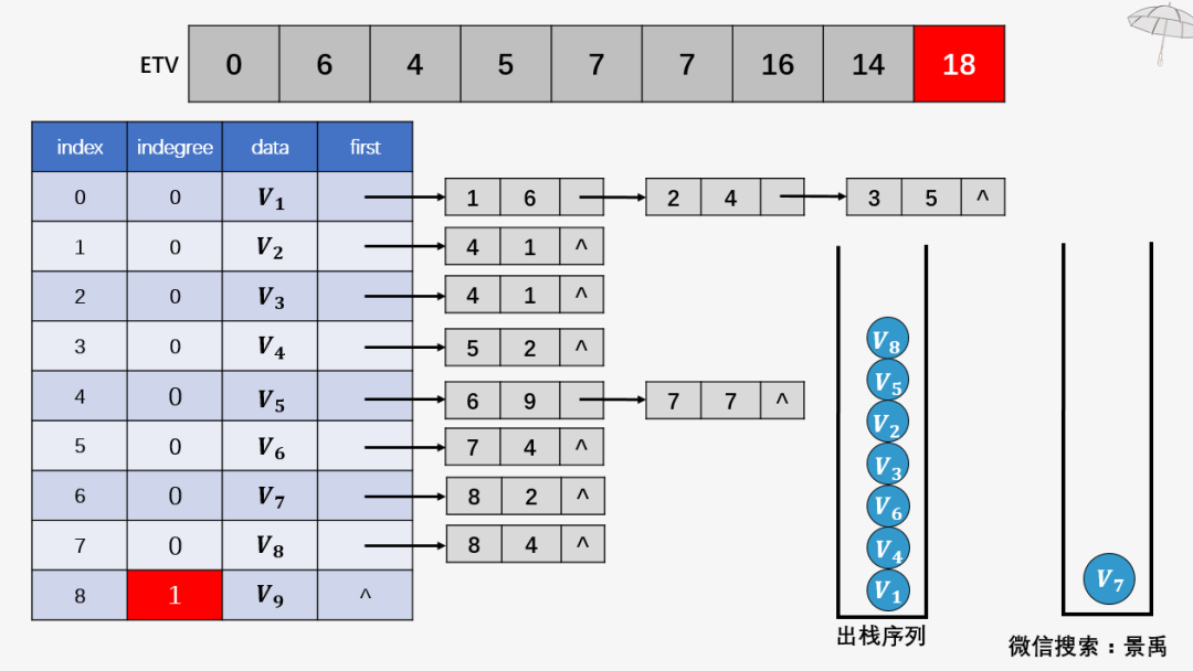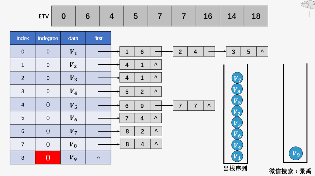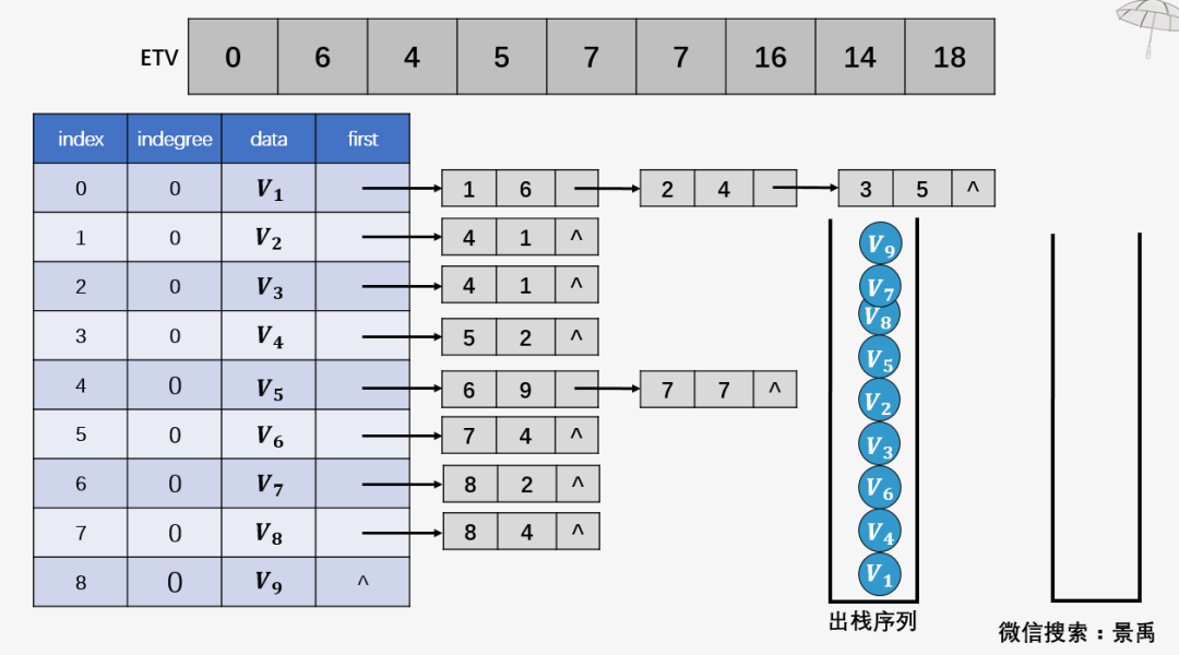 首先求事件的最早发生事件ETV,这里使用的就是之前分享的拓扑排序,我们也走一遍,算是对拓扑排序的回顾。不清楚的小禹禹可以回头看看之前的文章 图解:什么是拓扑排序?