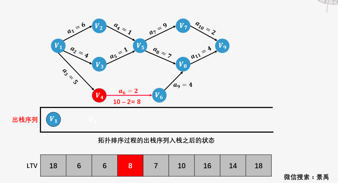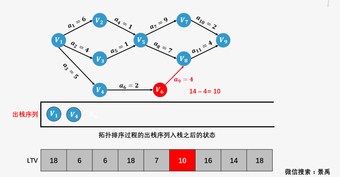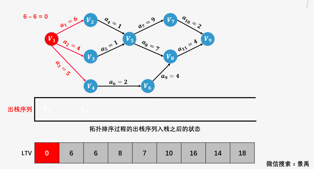 第四步,弹出栈顶元素,并遍历的邻接顶点, 用顶点的LTV(最晚发生时间) 减去活动所需时间,即为6,将顶点的LTV[1] 更新为6.