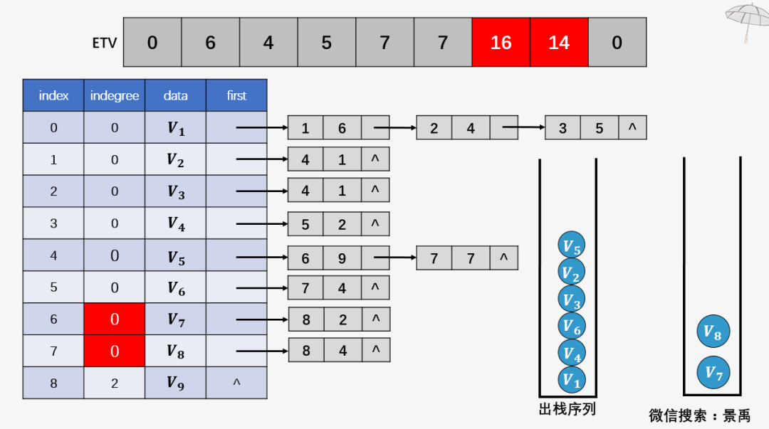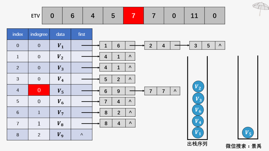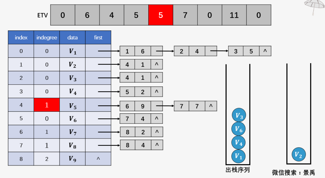 第四步:弹出栈顶元素并遍历顶点的邻接顶点. 将顶点的入度减一,并将 ETV[5] 更新为 ETV[3] +,即为7.