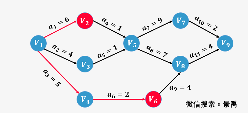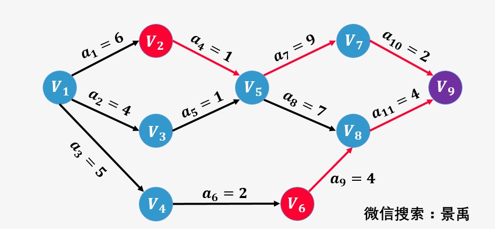 由于AOE网中的有些活动是可以并行进行的(如活动、和就是可以并行进行的),所以完成工程的最短时间是从源点到汇点的最长路径的长度。路径长度最长的路径就叫做 关键路径(Critical Path)。如下图中红色顶点和有向边构成的就是一条关键路径,关键路径的长度就是完成活动、 和、所需要的时间总和,即为 6+1+9+2 = 18.