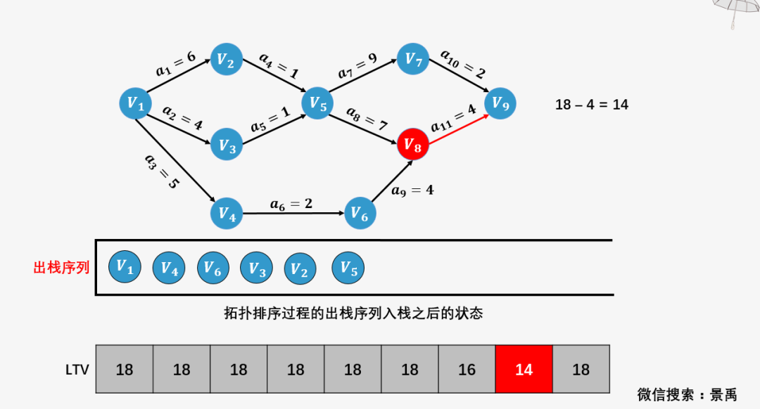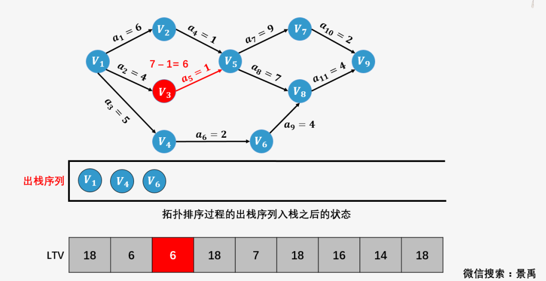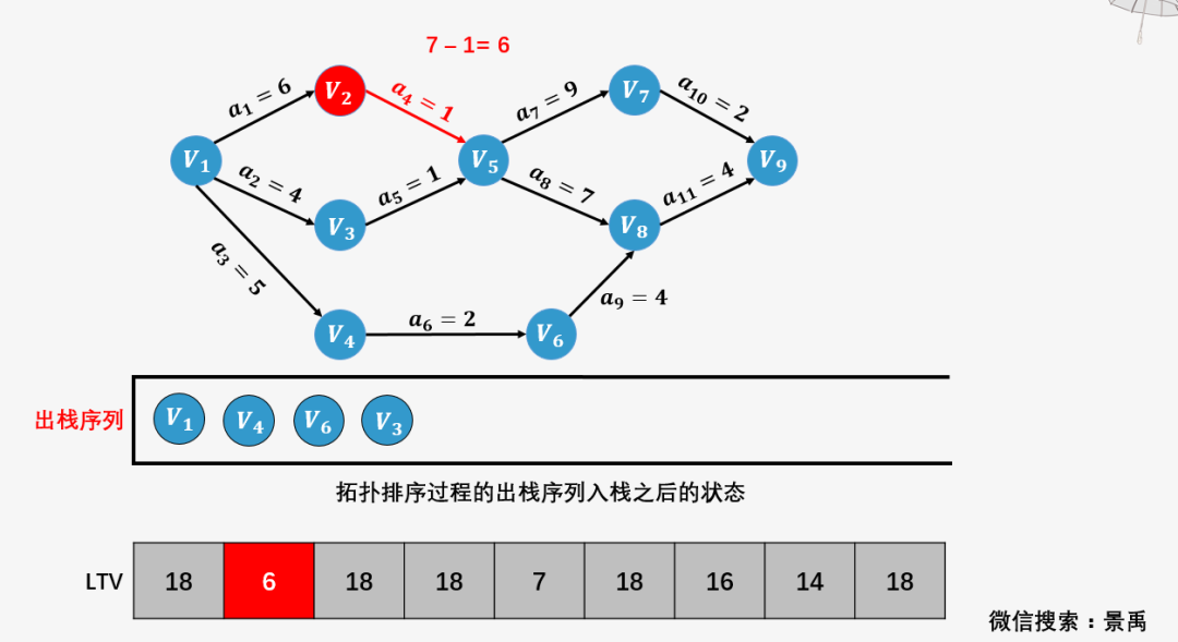 通过拓扑排序我们获得了每一个顶点的最早发生时间 ETV,紧接着便可以计算 LTV了。