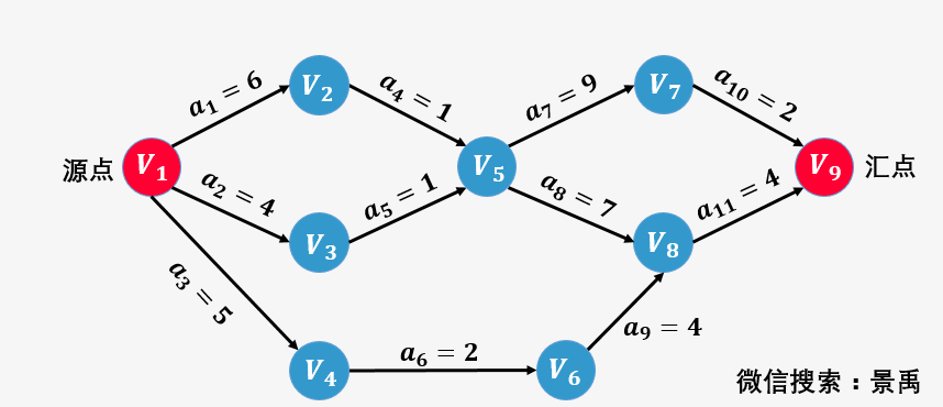 打个比方,我们现在有一个工程,就是将大象装进冰箱,那么源点就相当于我们现在接到这样一个任务,而汇点则表示我们完成了这个任务。那么我们之前所讲的打开冰箱门,将大象装进去,关上冰箱门就属于活动本身(即 所表示的信息),打开冰箱门所需要的时间就是活动所需要的时间,而完成某一个活动所到达的顶点就表示一个事件(冰箱门打开)。下图中的红色顶点表示源点, 表示汇点。
