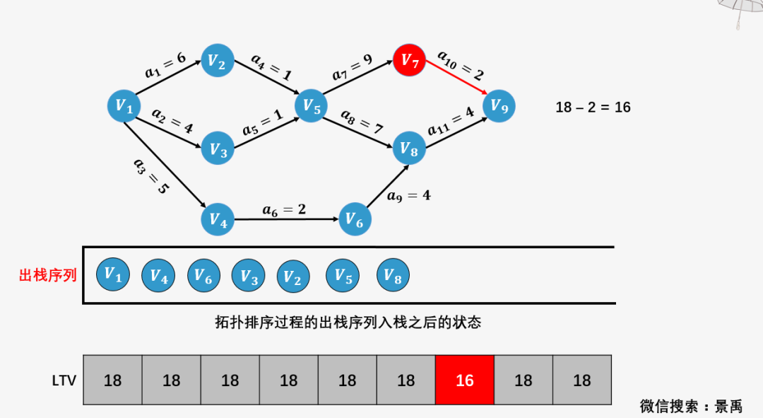 计算LTV的值,即每一个顶点的最晚发生时间值,初始时将LTV的值初始化为汇点的时间 18 。