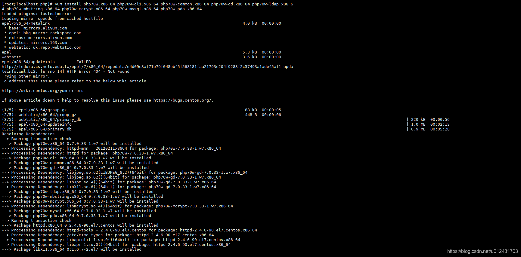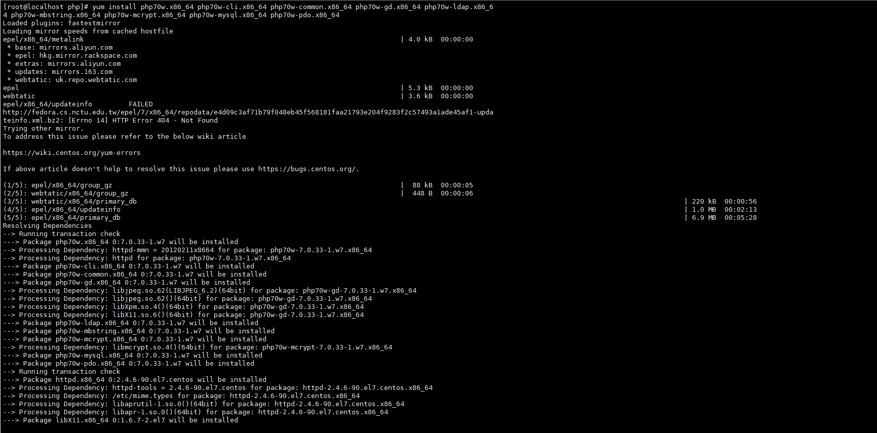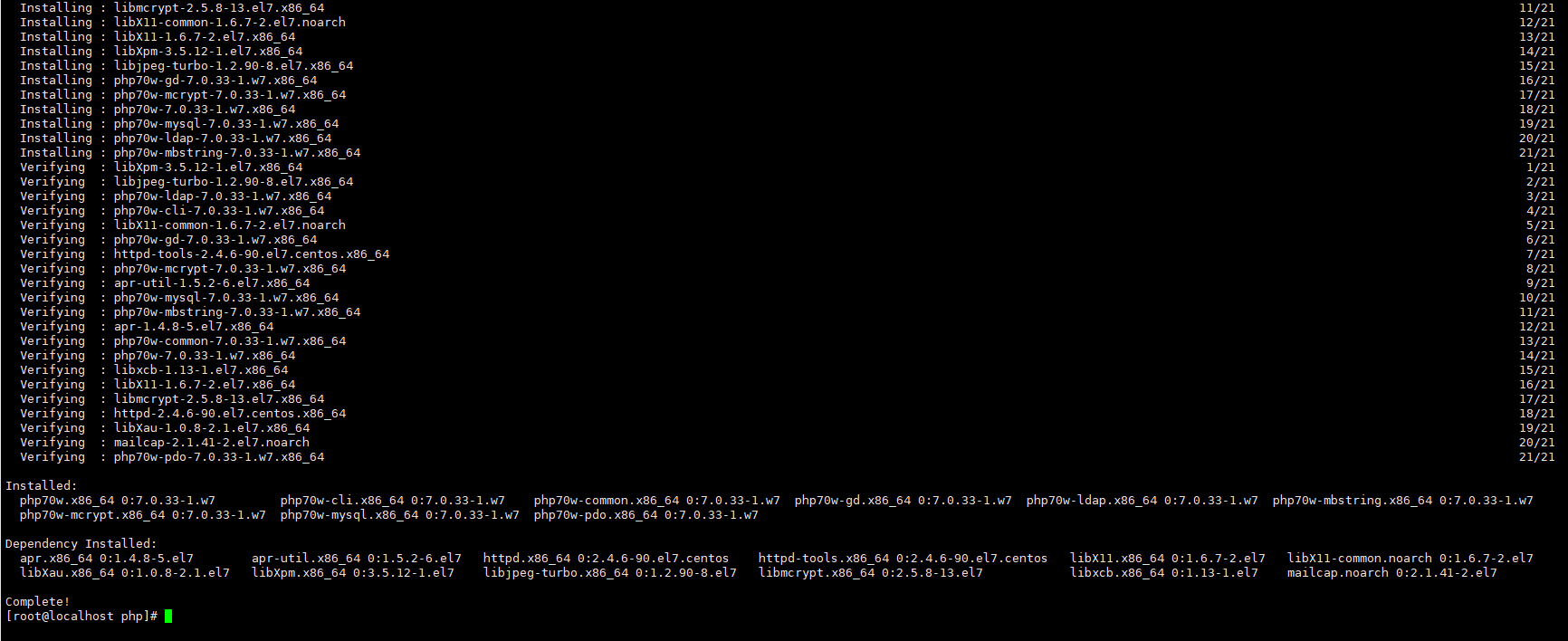 # yum install php70w.x86_64 php70w-cli.x86_64 php70w-common.x86_64 php70w-gd.x86_64 php70w-ldap.x86_64 php70w-mbstring.x86_64 php70w-mcrypt.x86_64 php70w-mysql.x86_64 php70w-pdo.x86_64