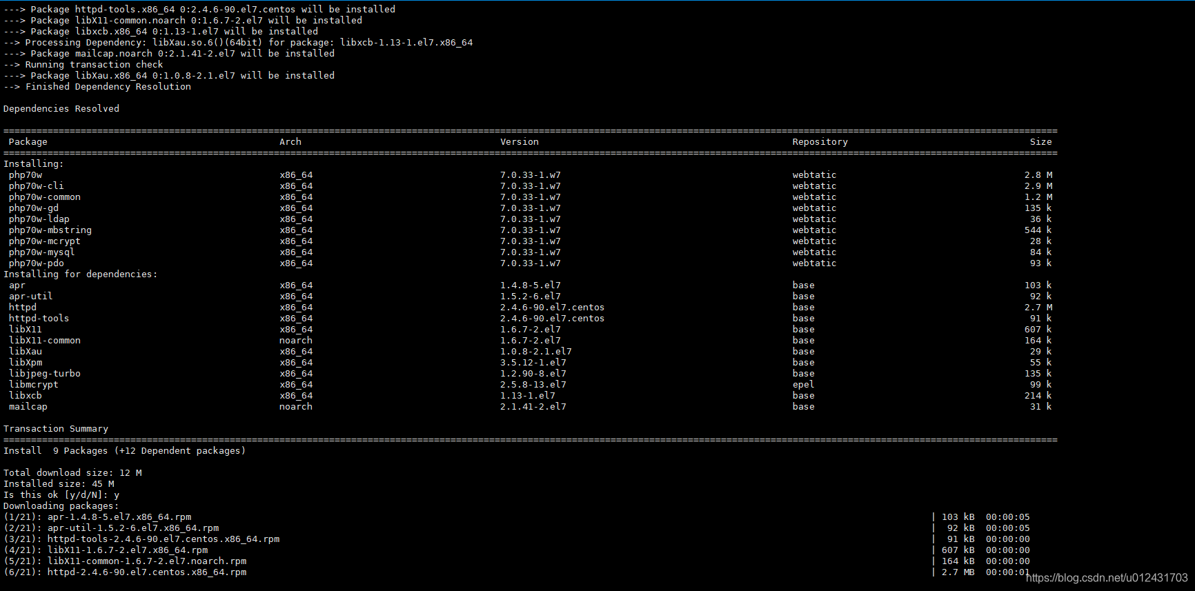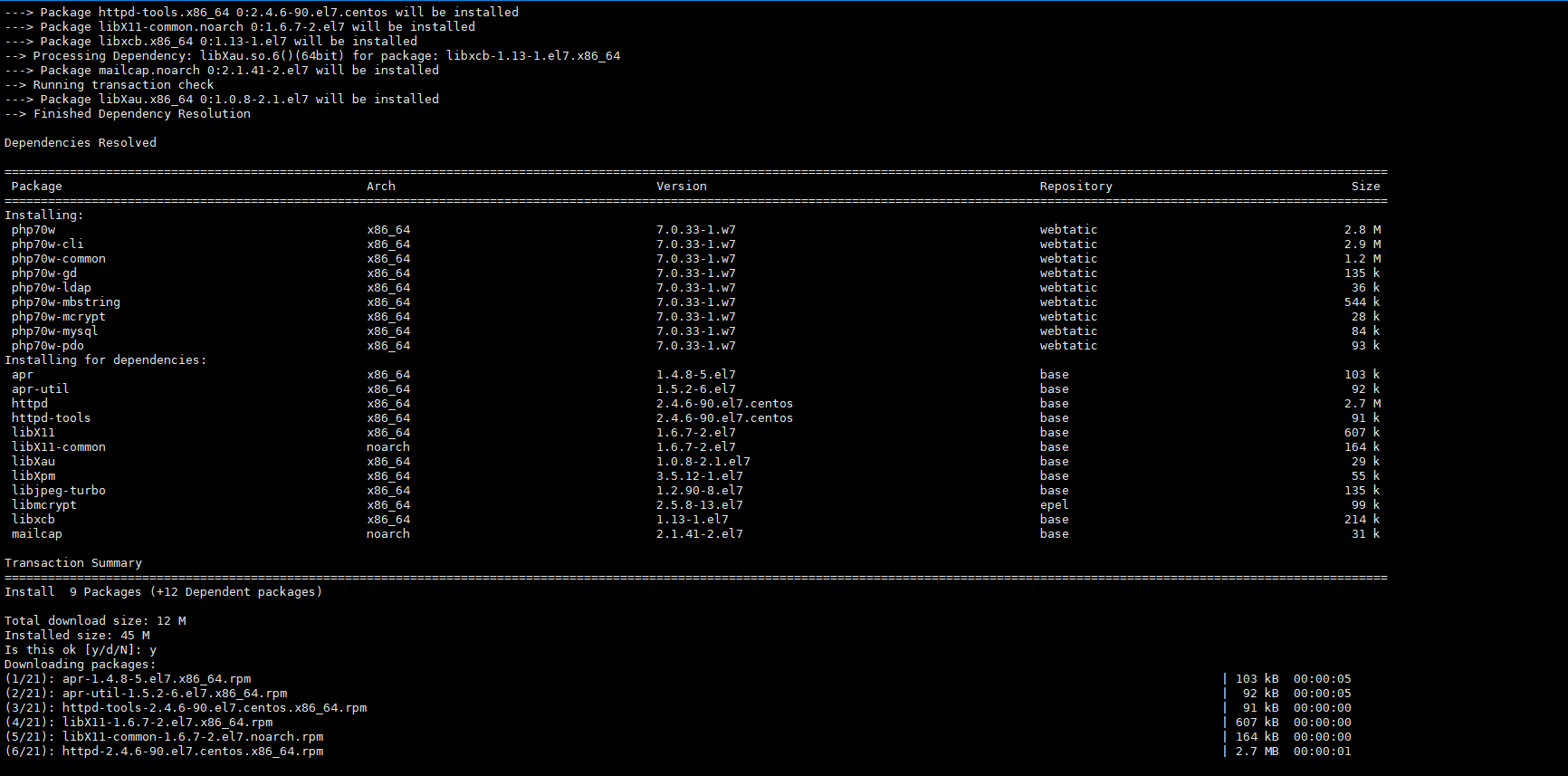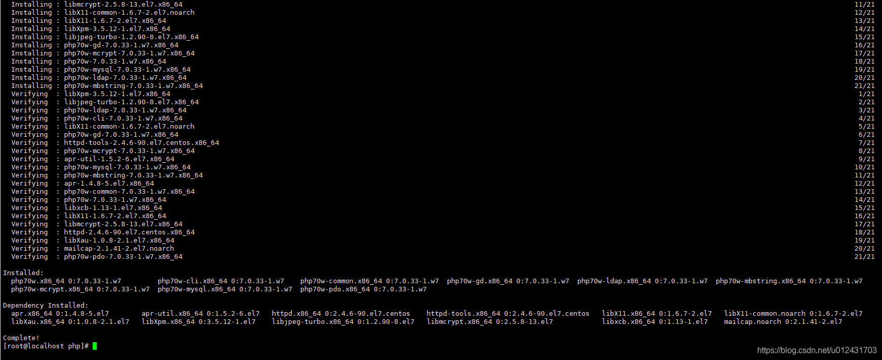 # yum install php70w.x86_64 php70w-cli.x86_64 php70w-common.x86_64 php70w-gd.x86_64 php70w-ldap.x86_64 php70w-mbstring.x86_64 php70w-mcrypt.x86_64 php70w-mysql.x86_64 php70w-pdo.x86_64