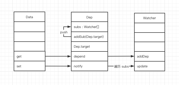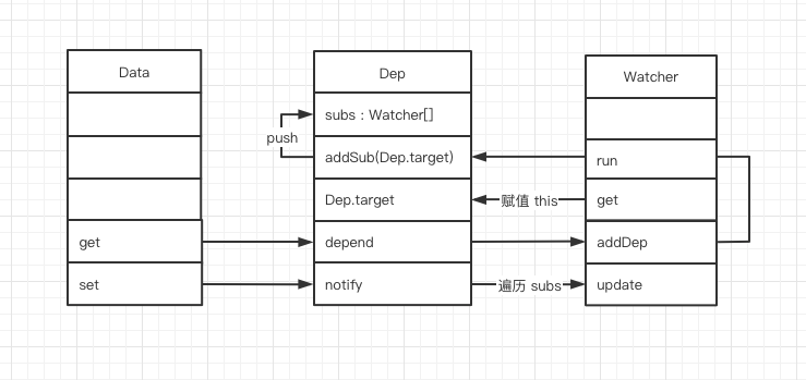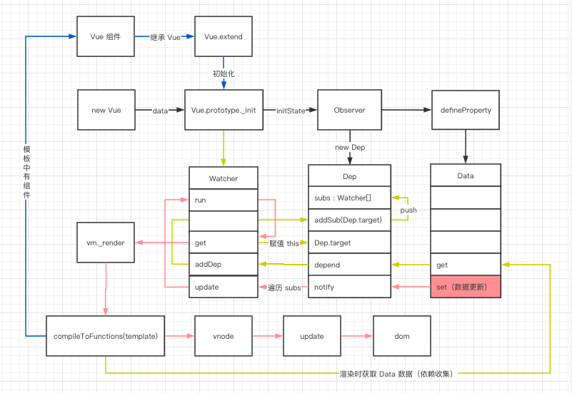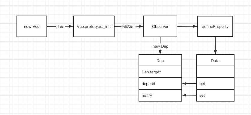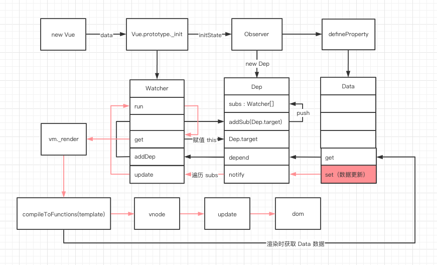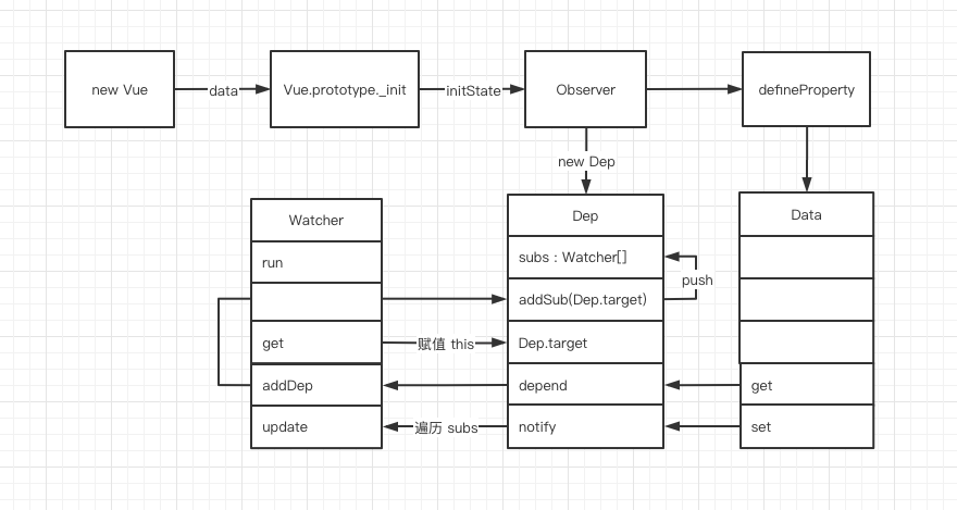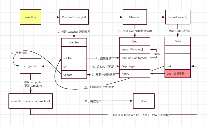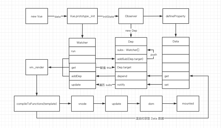 - 从 new Vue 开始,首先通过 get、set 监听 Data 中的数据变化,同时创建 Dep 用来搜集使用该 Data 的 Watcher。