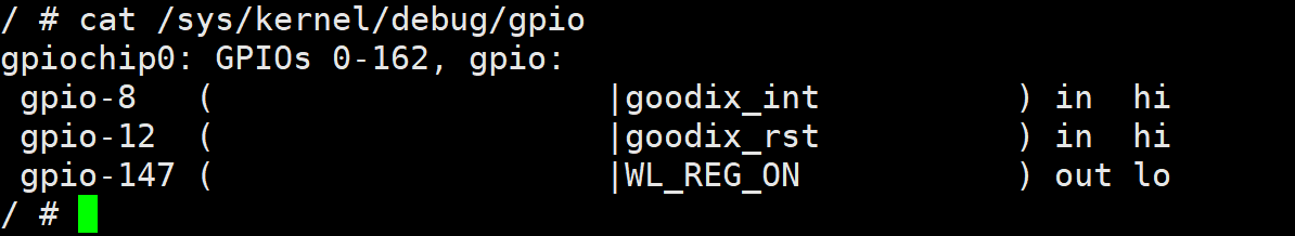例如第一行的意思是编号为8的GPIO的名字是goodix-int,现在是输入模式并且是高电平。已经被占用的GPIO无法使用,除非修改其寄存器。