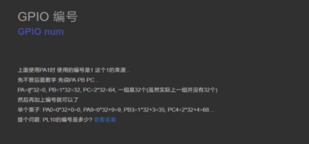 有些的芯片运行的Linux系统里面自带了引脚的编号,如果要获取编号可能要在该芯片文档中用公式计算。以Orange-pi为例它的计算公式如图所示: