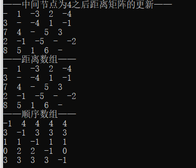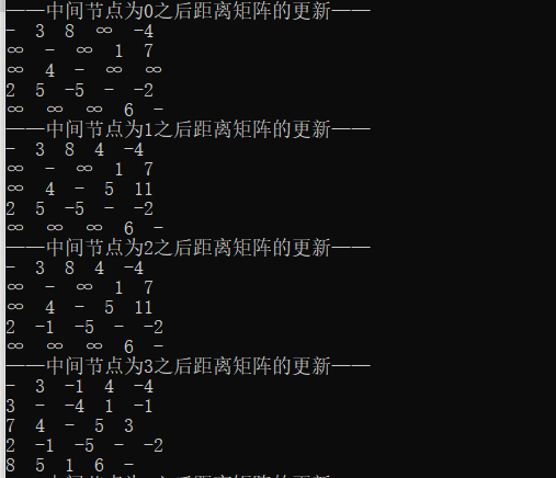 cout<<"——中间节点为"<<k<<"之后距离矩阵的更新——"<<endl;
