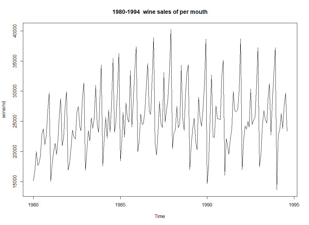 > library(forecast)这里我选择使用forecast包中自带的wineind数据集来展开实例讲解,共有176个月数据,从1980年1月到1994年8月澳大利亚的全国总销售酒量