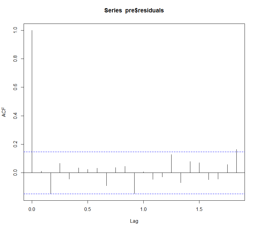 > Box.test(pre$residuals, lag=1, type="Ljung-Box")构造残差的自相关图,确定box检验中的lag的系数为1