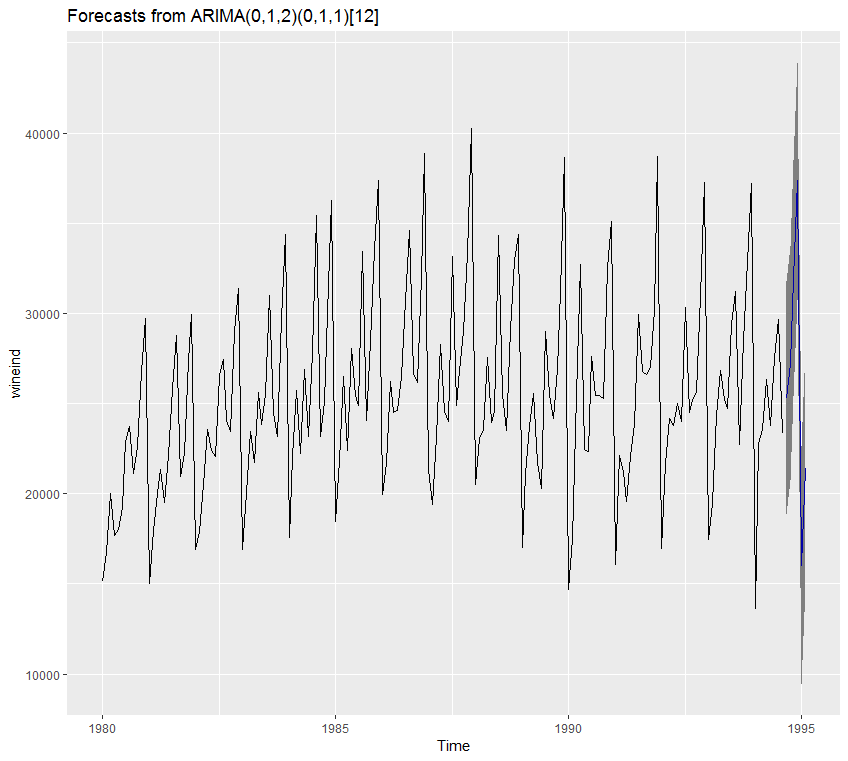 arima(x = wineind, order = c(0, 1, 2), seasonal = list(order = c(0, 1, 1), period = 12),