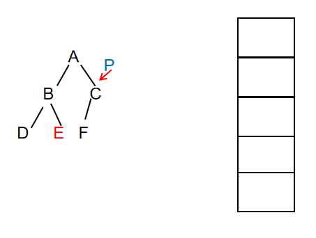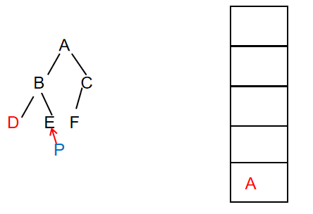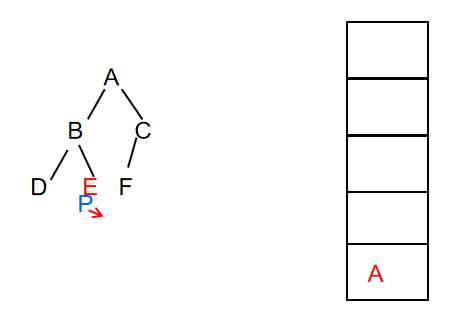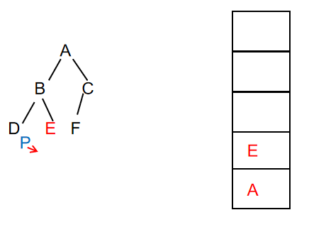 - 继续遍历结点,此时E结点的右孩子为空,则将栈顶元素出栈,P指向A结点的右孩子
