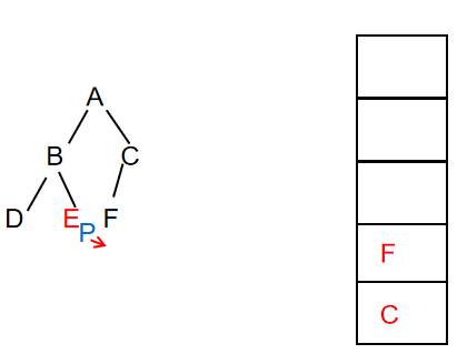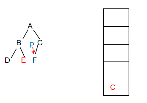 此时F结点的右孩子也为空,继续将栈顶元素C出栈,P指向C结点的右孩子,此时P指向的结点为空,栈也为空,遍历结束。