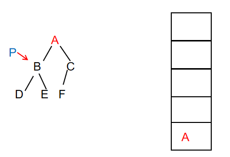 - 根节点A入栈,并打印该结点的值,P指向其左孩子