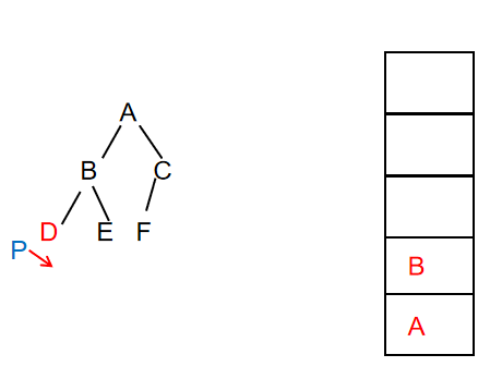 - 继续遍历结点,此时D结点的右孩子不存在,则将栈顶元素出栈,P指向B结点的右孩子