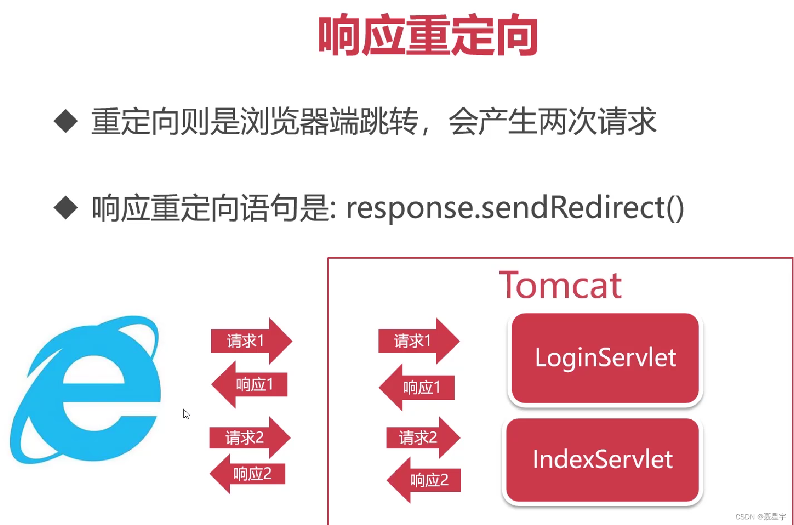 2.响应重定向是使用响应对象进行处理,而响应是服务器发往客户端的。