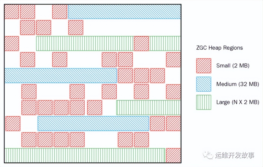 ZGC 的内存布局说起。与 Shenandoah 和 G1一样,ZGC 也采用基于 Region 的堆内存布局,但与它们不同的是 , ZGC 的 Region 具 有 动 态 性 (动态创建和销毁 , 以及动态的区域容量大小)。在 x64硬件平台下 , ZGC 的 Region 可以具有大、中、小三类容量(如下图所示):