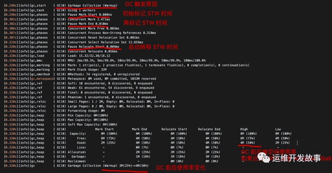 Heap信息:记录了GC过程中Mark、Relocate前后的堆大小变化状况。High和Low记录了其中的最大值和最小值,我们一般关注High中Used的值,如果达到100%,在GC过程中一定存在内存分配不足的情况,需要调整GC的触发时机,更早或者更快地进行GC。