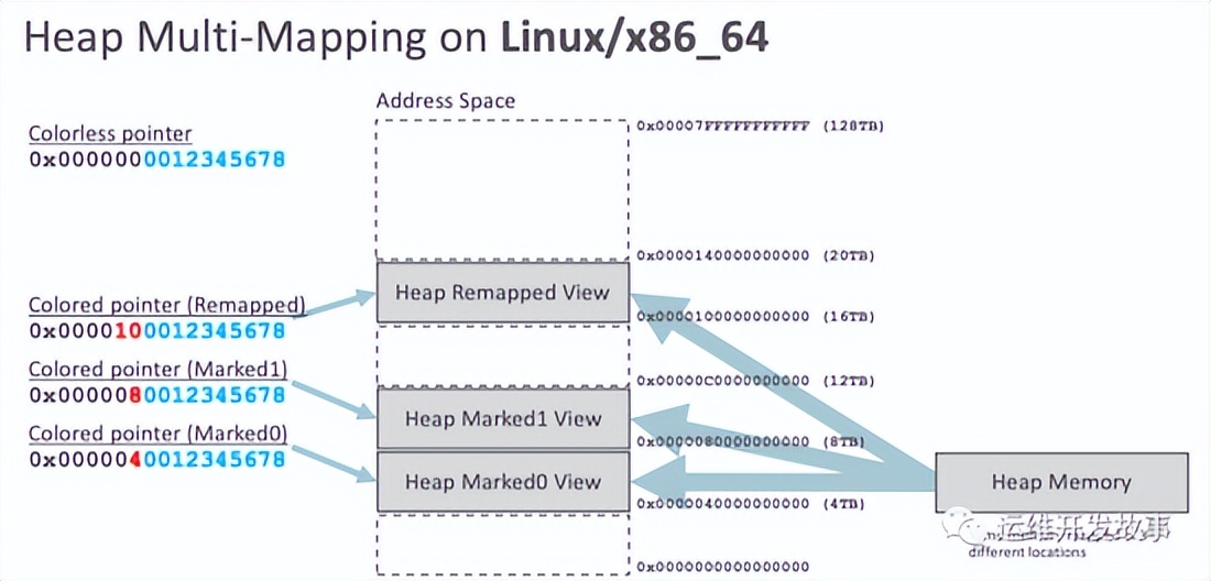 不同的虚拟机内存到物理内存的转换关系可以在硬件层面,操作系统层面或者软件层面来实现。在 Linux 平台上 ZGC 采用了多重映射(Mult-Mapping)将多个不同的虚拟内存地址映射到同一个物理内存地址上,着是一种多对一映射,一位着 ZGC 在虚拟内中看到的地址空间要比时机的堆内存容量来得更大。把染色指针中的标志位看作是地址分段符,那只要将这些不同的地址分段符都映射到同一个福利内空间,经过多重映射转换后,就可以直接使用染色指针进行寻址了,如下图所示: