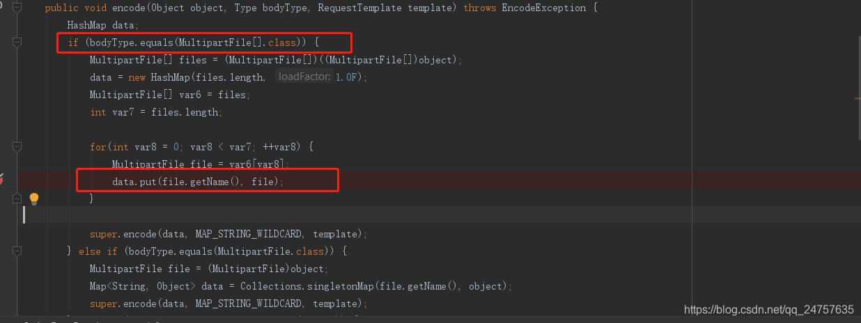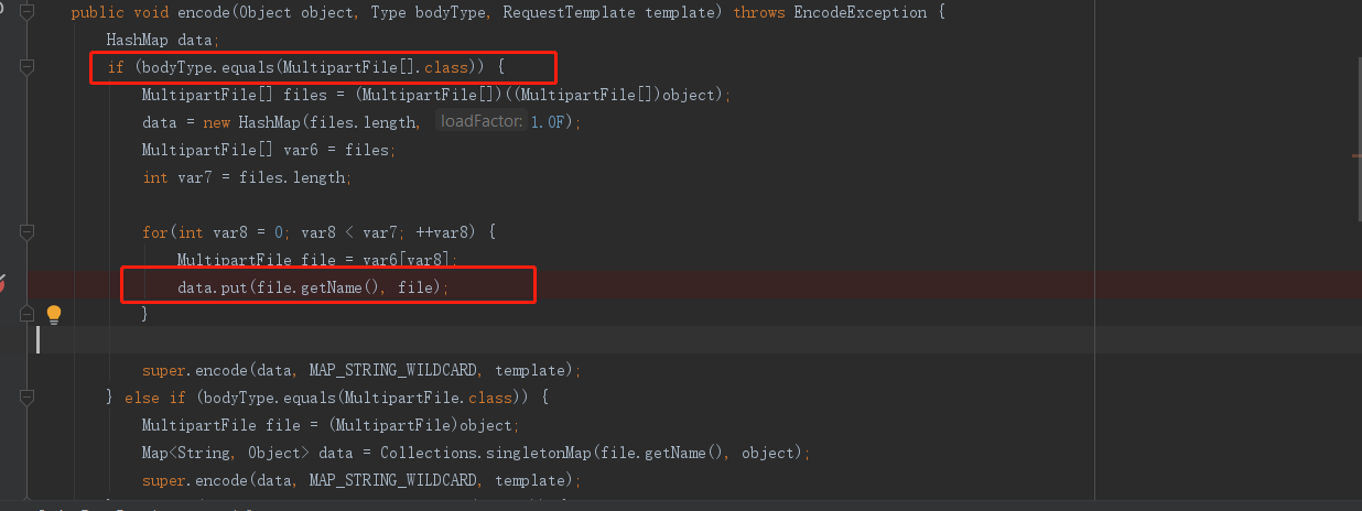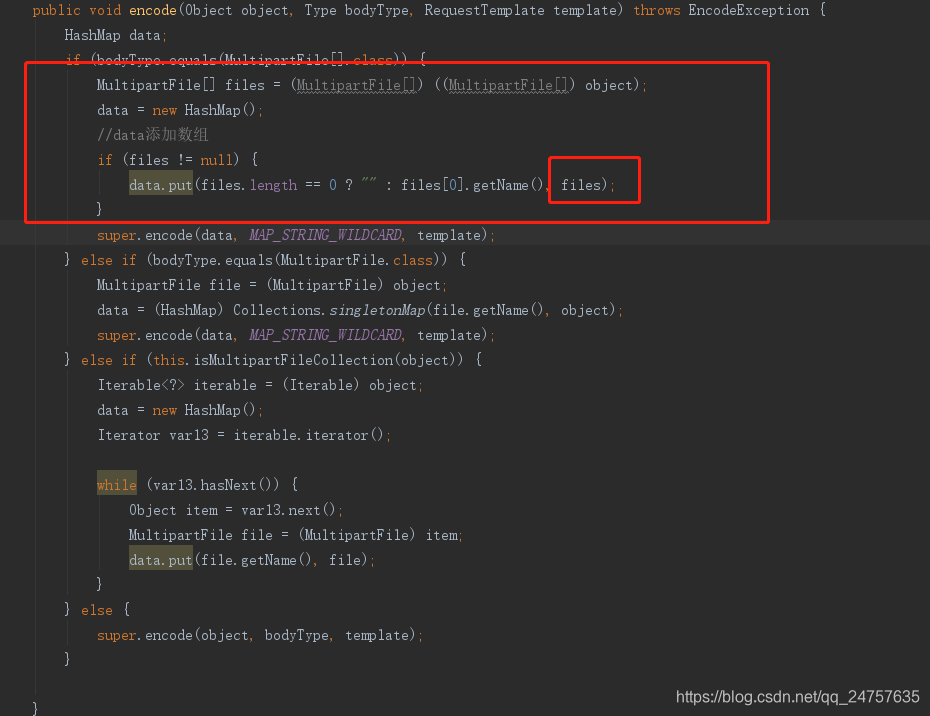 SpringFormEncoder 部分源码,网上很多说没有MultipartFile[]类型的判断,我这里用的版本较新,虽然有数组类型的判断,但是因为数组里每个元素file.getName()都是相同,它作为map的键,data前面的值会被覆盖,所以只存在最后一个元素