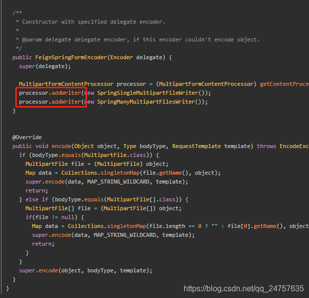 最后新建 FeignSpringFormEncoder 类,把源码复制到 FeignSpringFormEncoder 中修改
